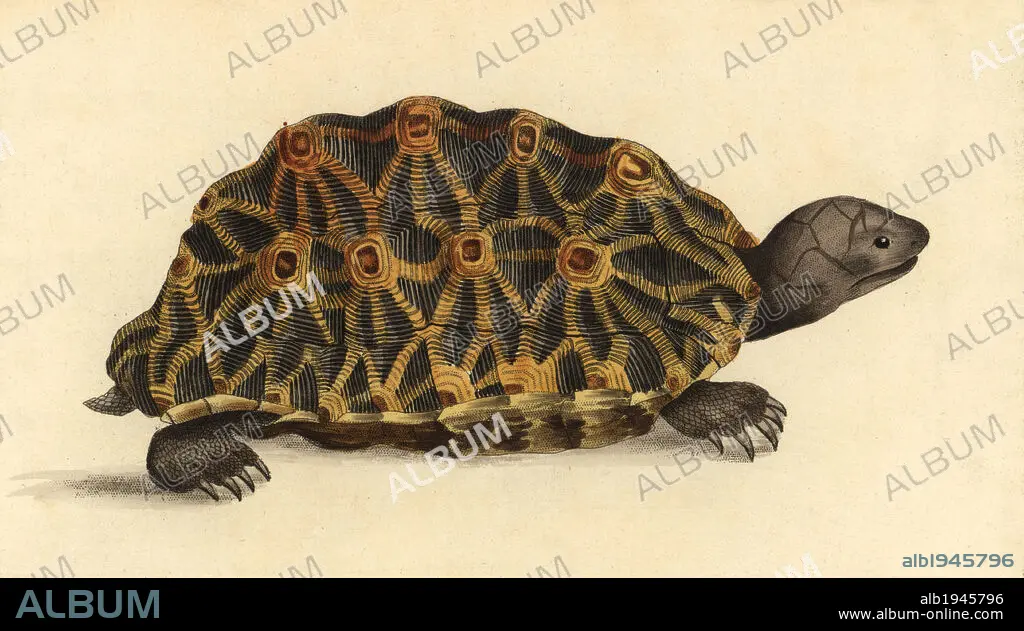 Caption: Geometric tortoise, Psammobates geometrica. Endangered. Illustration signed RPN (Richard Nodder). Handcolored copperplate engraving from George Shaw and Frederick Nodder's "The Naturalist's Miscellany" 1797. Frederick Polydore Nodder (1751~1801?) was a gifted natural history artist and engraver. Nodder honed his draftsmanship working on Captain Cook and Joseph Banks' Florilegium and engraving Sydney Parkinson's sketches of Australian plants. He was made "botanic painter to her majesty" Queen Charlotte in 1785. Nodder also drew the botanical studies in Thomas Martyn's Flora Rustica (1792) and 38 Plates (1799). Most of the 1,064 illustrations of animals, birds, insects, crustaceans, fishes, marine life and microscopic creatures for the Naturalist's Miscellany were drawn, engraved and published by Frederick Nodder's family. Frederick himself drew and engraved many of the copperplates until his death. His wife Elizabeth is credited as publisher on the volumes after 1801. Their son Richard Polydore (1774~1823) was responsible for the plates signed RN or RPN. Richard exhibited at the Royal Academy and became botanic painter to King George III.