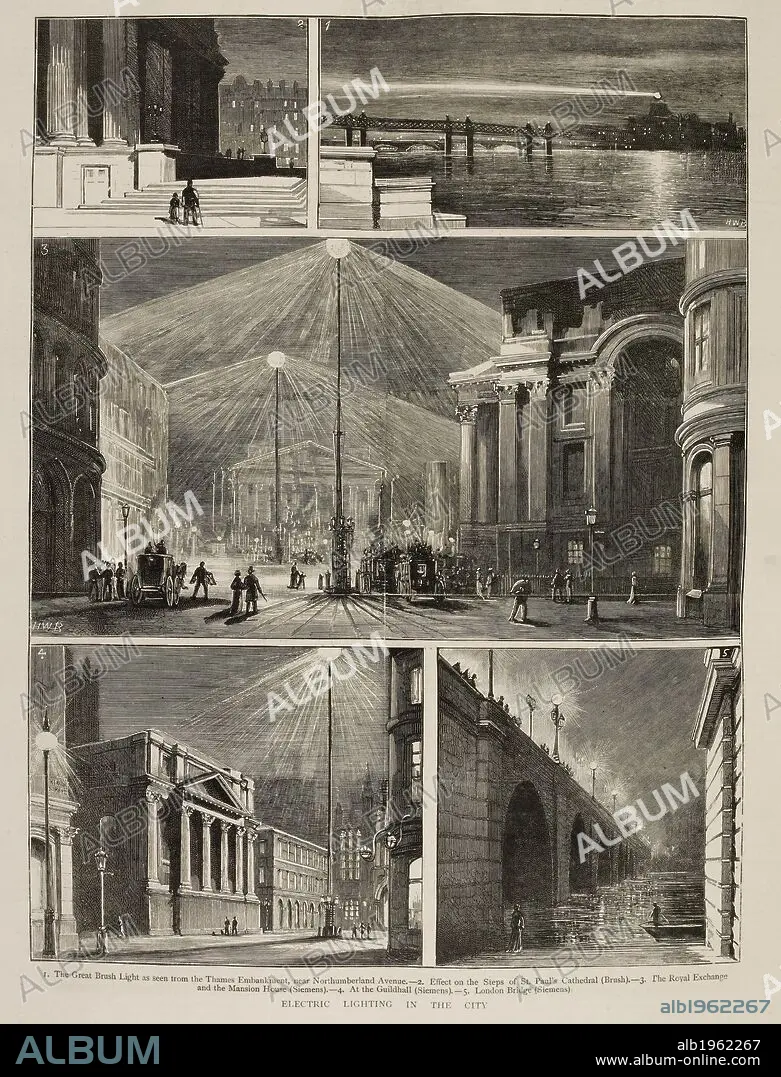 Caption: 'Electric lighting in the city'. Various views of 19th century London at night, lit by the new electric lighting. The Graphic. London, 9 April 1881. Source: The Graphic 09/04/1881, p. 348.