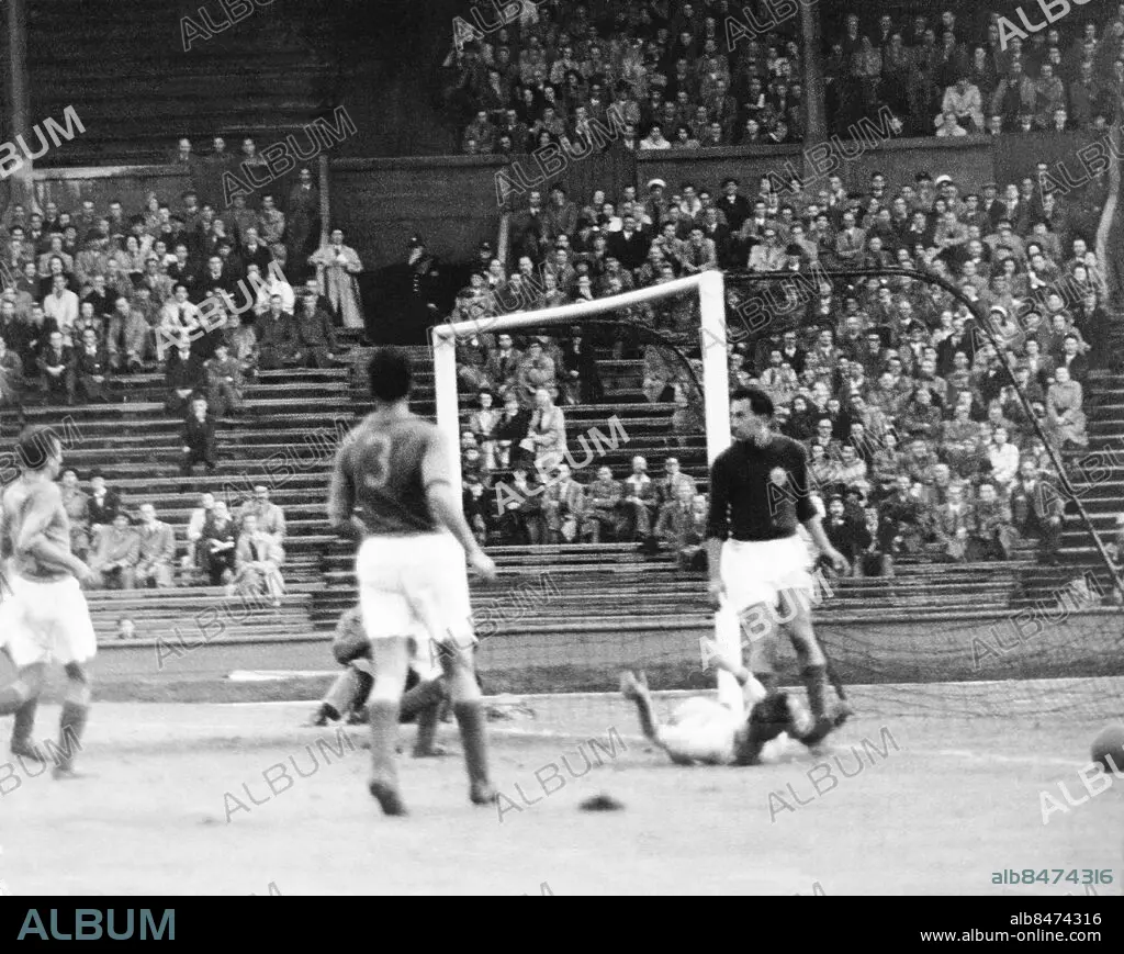 ARKIV 1948 . Sverige möter Jugoslavien i finalmatchen vid OS i London 1948 och vinner med 3-1. Målen görs av Gunnar Gren, som gör två mål, ett på straff. Det viktiga 2-1 målet görs av Gunnar Nordahl.. Team Sweden wins the final in football against Jugoslavia. Foto: TT / Kod 1900.