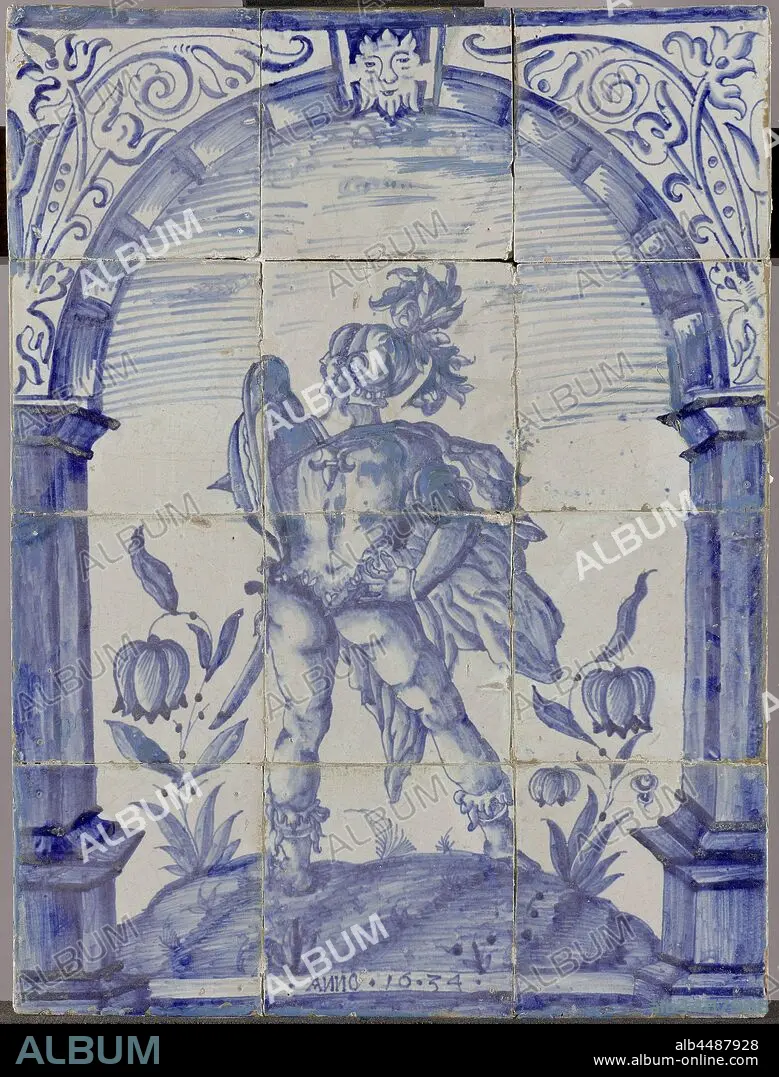 Tile panel with Marcus Valerius Corvus, Tile panel of twelve blue painted tiles (4 x 3) with the Roman hero Marcus Valerius Corvus seen in armor on the back, standing on a ground between plants. He stands under an arch with a mask as the keystone and floral scrolls in the turns. At the bottom of the inscription: .ANNO. 16.34, (story of) Marcus Valerius Corvus (Corvinus), anonymous, Holland, 1634, earthenware, tin glaze, h 54 cm × w 40.7 cm × d 3 cm