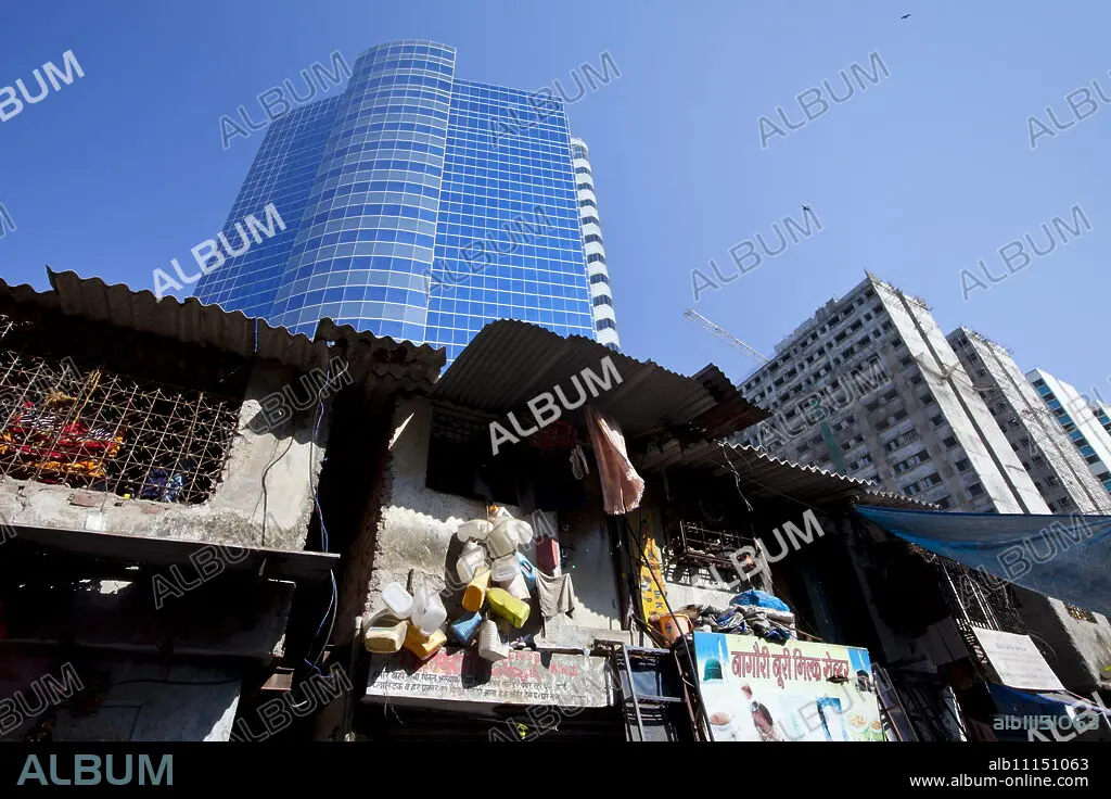 Essar House office development for Essar Group by slums in Mahalaxmi area of Mumbai, India shows contrast of rich and poor