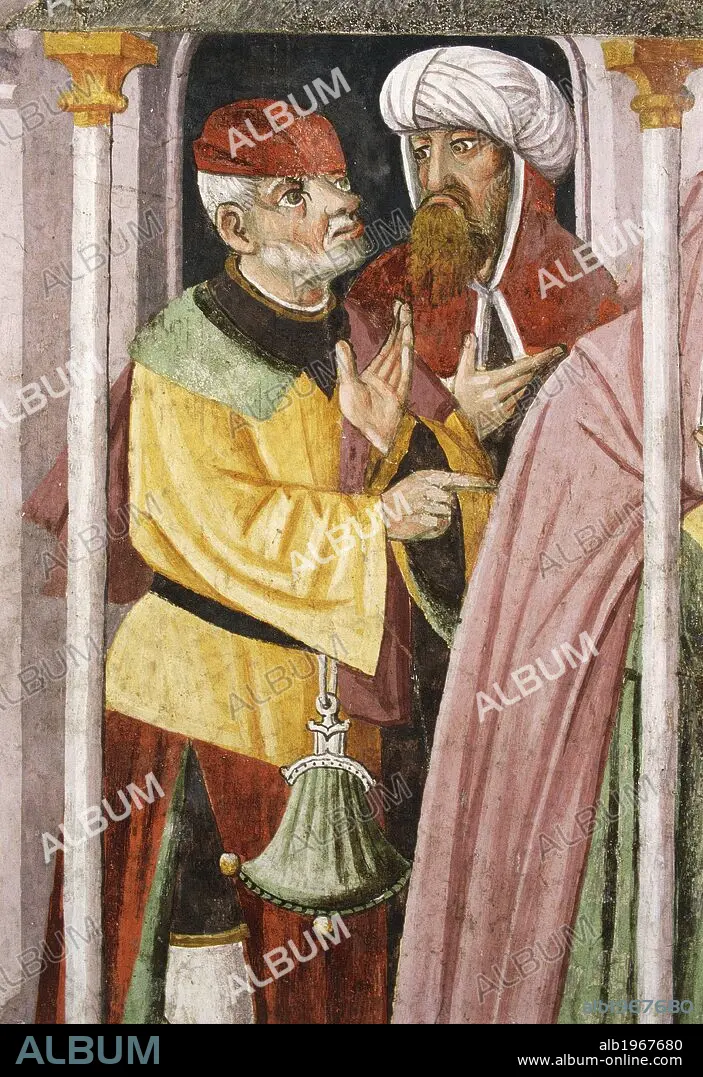 Caption: Jews in medieval oriental clothes, detail from the Remorse of Judas, fresco, by Giovanni Canavesio, 1491, in the Notre-Dame des Fontaines Chapel, La Brigue. France, 15th century.