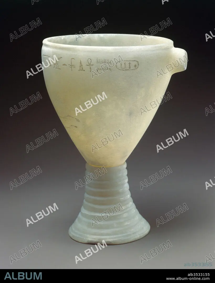 Caption: Brewer's Vat of Queen Mother Ankhenes-Pepi, Old Kingdom, Dynasty 6, ca. 2246–2152 B.C., From Egypt; Probably from Memphite Region, Saqqara, South Saqqara, Travertine (Egyptian alabaster), H. 17.3 × diam. 11.4 cm (6 13/16 × 4 1/2 in.); spout L. 1.5 cm (9/16 in), This miniature spouted basin on a stand is copied from a large pottery brewer's vat that would have rested on a woven reed stand. It was probably part of the funerary equipment of Queen Mother Ankhnes-Pepi or of her son Pepi II