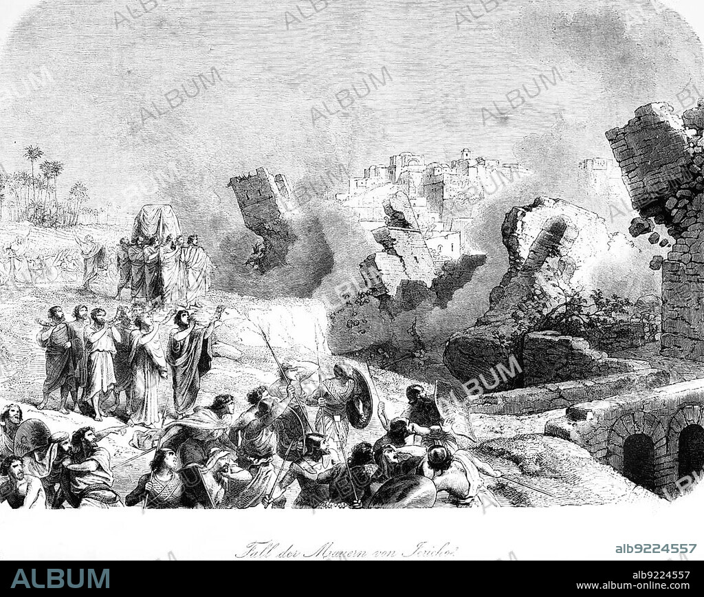 Caption: Fall of the Walls of Jericho, city wall, many people, warriors, destroy, bridge, misfortune, Ark of the Covenant, rubble, Bible, Old Testament, The Book of Joshua, illustration around 1850, Middle East