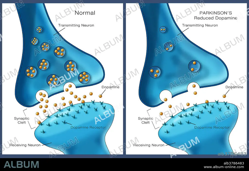 Caption: Labelled illustration showing low levels of the neurotransmitter dopamine in a neuron affected by Parkinson's disease (right) and normal levels on the left.