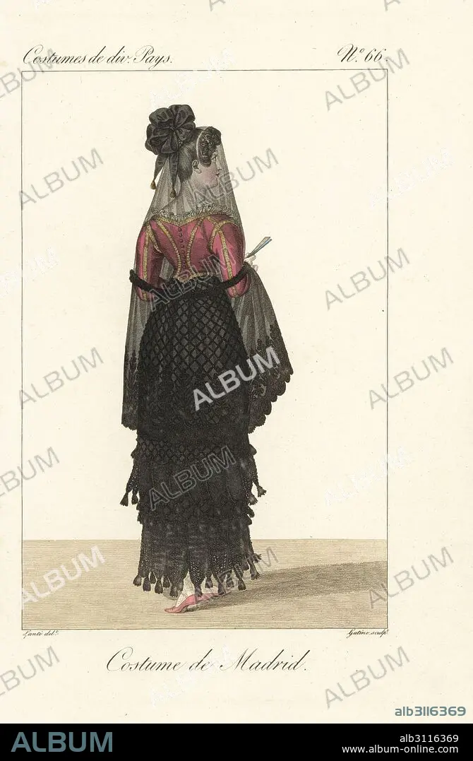 Caption: Woman of Madrid, Spain, 19th century. She wears a seethrough mantilla veil with black ribbons, coral pink bodice, fringed basquina dress and carries a fan. Handcoloured copperplate engraving by Georges Jacques Gatine after an illustration by Louis Marie Lante from Costumes of Various Countries, Costumes de Divers Pays, Paris, 1827.