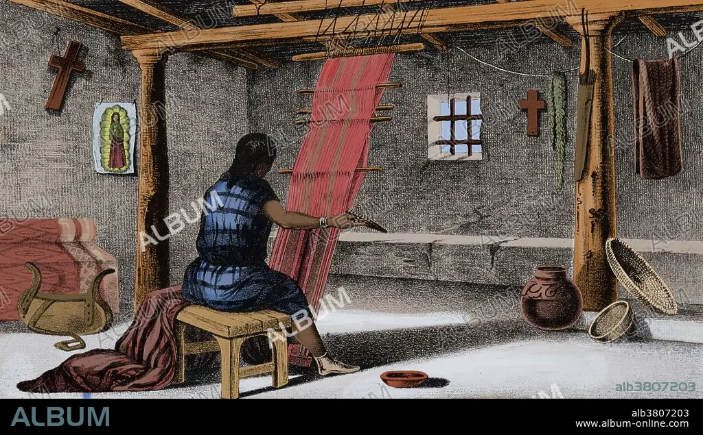 Pueblo Zuni weaving in New Mexico. An Illustration by R. H. Kern from "Report of an Expedition Down the Zuni and Colorado Rivers in 1851," by Captain L. Sitgreaves. Lorenzo Sitgreaves, along with a team of topographers, naturalists, artists, and infantrymen explored and mapped the Zuni and Colorado Rivers in America. Sitgreaves' official report was published in 1853. This image has been colorized.