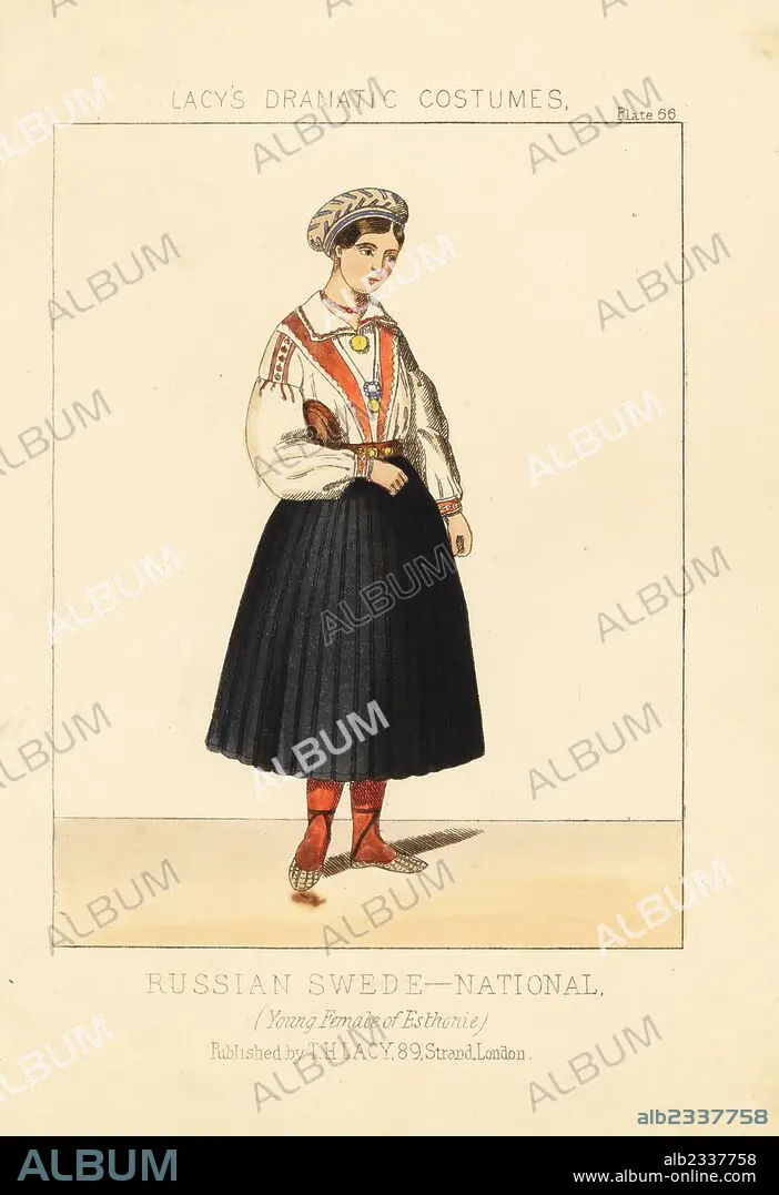 Caption: Young woman of Estonia, Russian Swede national costume, 19th century. Handcoloured lithograph from Thomas Hailes Lacy's "Female Costumes Historical, National and Dramatic in 200 Plates," London, 1865. Lacy (1809-1873) was a British actor, playwright, theatrical manager and publisher.