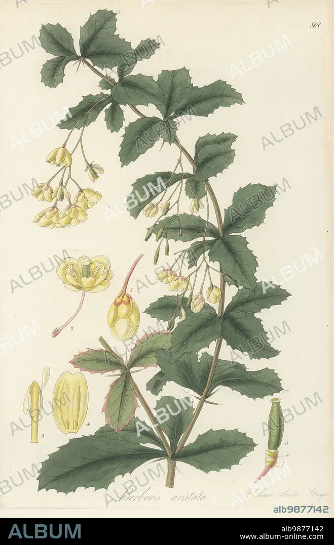 Indian barberry, mara manjal, chutro, sumbal, tree turmeric, or aristate barberry, Berberis aristata. Native to the Himalayas, seeds sent by Dr Nathaniel Wallich from Nepal, used in Ayurveda traditional medicine. Handcoloured copperplate engraving by Joseph Swan after a botanical illustration by William Jackson Hooker from his Exotic Flora, William Blackwood, Edinburgh, 1823-27.