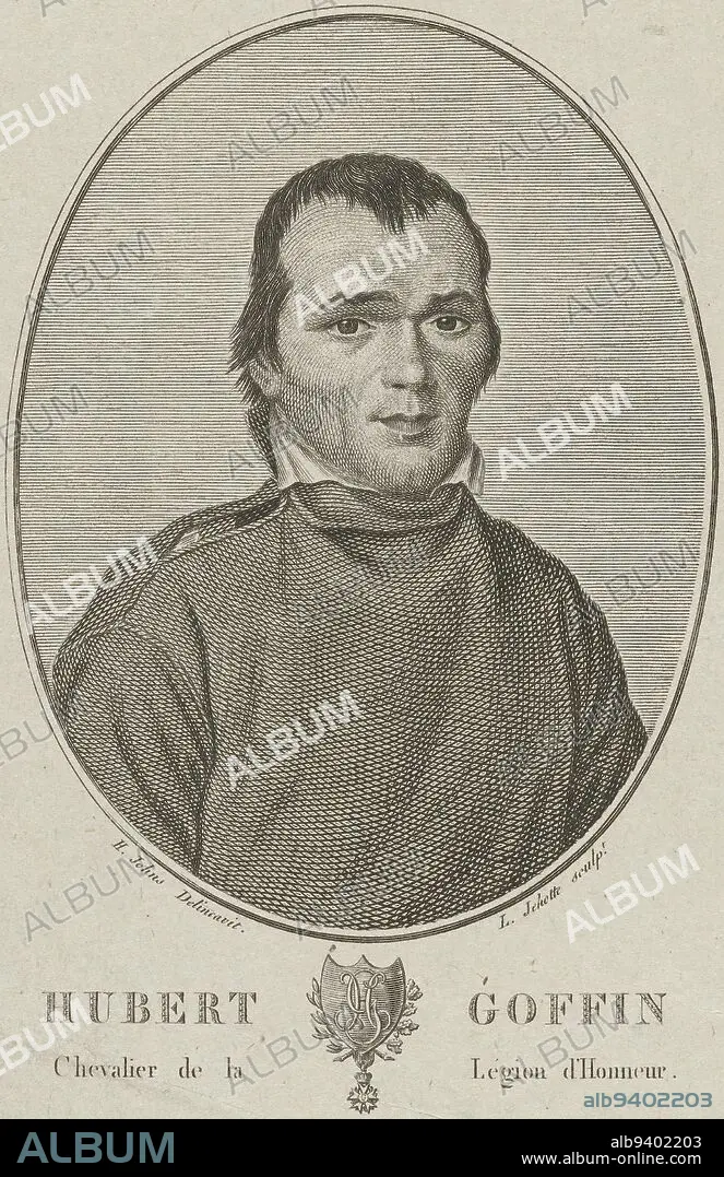 Portrait of Hubert Goffin, Léonard Jéhotte, after H. Johns, 1782 - 1851, Portrait bust of Hubert Goffin, Knight of the Legion d'Honneur. Below the frame a coat of arms with monogram and the name and function of the person portrayed. Below the coat of arms two lines in French., print maker: Léonard Jéhotte, (mentioned on object), intermediary draughtsman: H. Johns, (mentioned on object), Zuid-Nederland, 1782 - 1851, paper, engraving, h 195 mm × w 101 mm