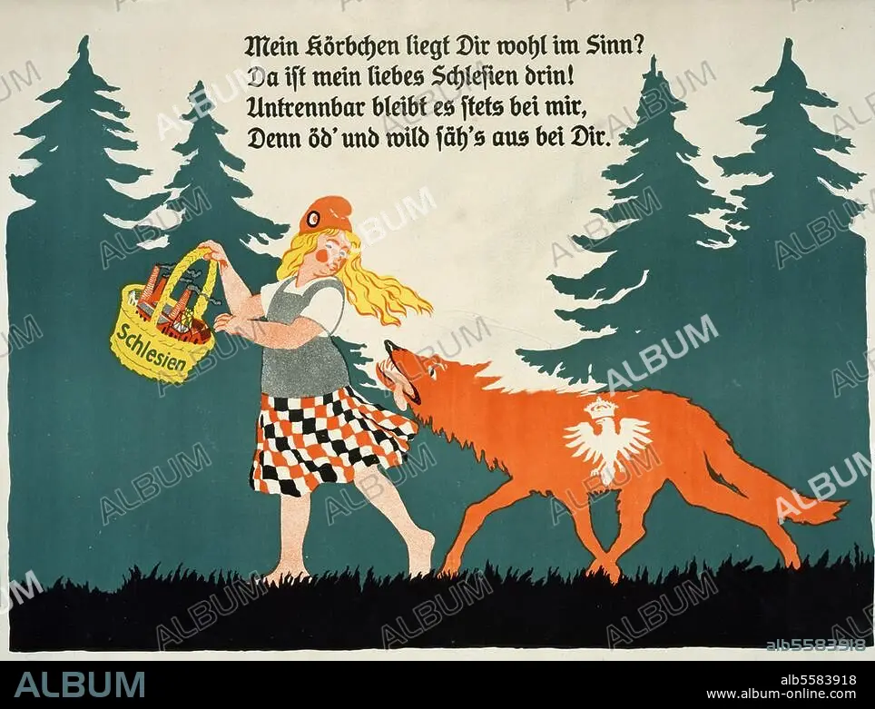 Caption: Germany: Weimar Republic / Silesia. Confrontation about the secession of parts of Upper Silesia to Poland, in accordance with Versailles Treaty. - Poster showing Little Red Riding Hood, protecting Silesia in her basket, refusing it to the wolf, who would only run it down. Allegorical Propaganda poster, about 1921.