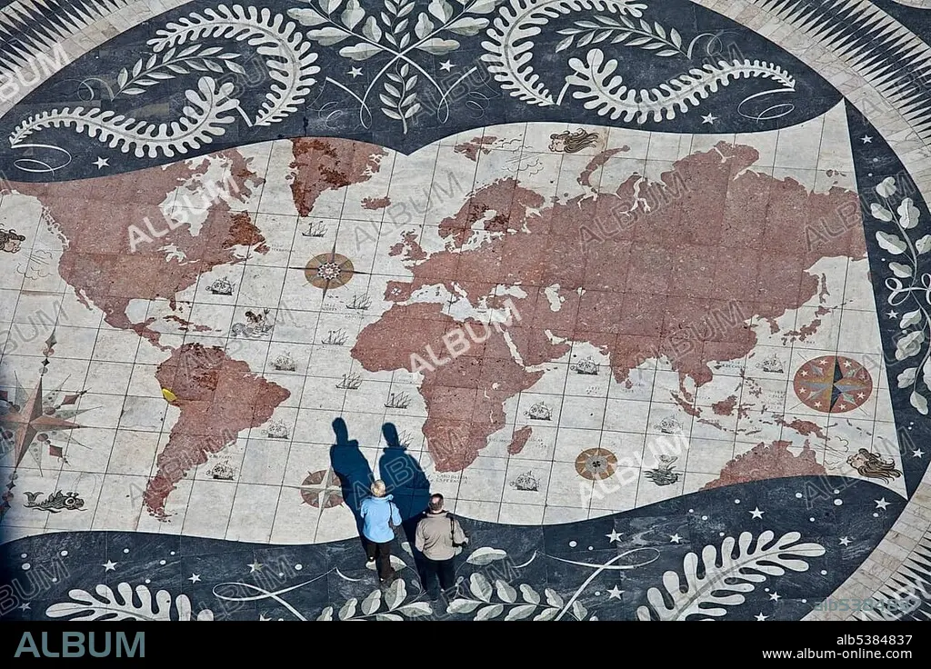 Tourists on a giant world map at the foot of the Monument to the Discoveries, Padrao dos Descobrimentos, Belem, Lisbon, Portugal, Europe