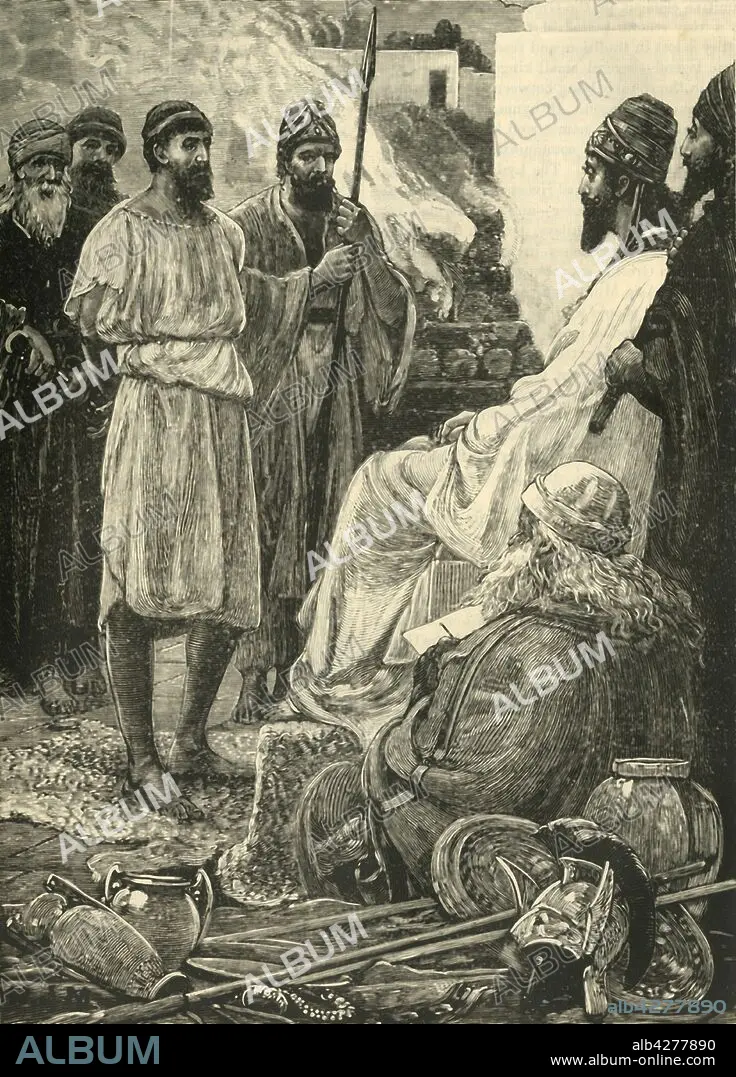 'Cyrus and Croesus', 1890. Croesus, king of Lydia, reigned from 560 BC until his defeat by Persian king Cyrus the Great, founder of the Achaemenid empire in 546 BC. From "Cassell's Illustrated Universal History, Vol. I - Early and Greek History", by Edmund Ollier. [Cassell and Company, Limited, London, Paris and Melbourne, 1890]