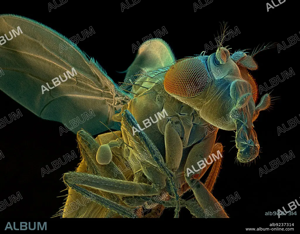Caption: Color-enhanced Scanning Electron Micrograph (SEM) of Drosophila melanogaster, also known as the common fruit fly or vinegar fly. Live, unfixed specimen; natural state. Magnification: 130X at 8 x 10" print size.