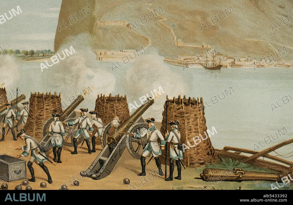 Caption: History of Spain. 18th century. Illustration depicting one of the sieges of Gibraltar. Spanish troops trying to recover the territory taken by the Anglo-Dutch coalition in 1704. Unsuccessful siege of Gibraltar. Chromolithography, detail. "Historia General de España" (General History of Spain), by Miguel Morayta. Volume V. Madrid, 1891.