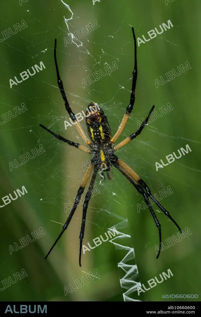 Caption: Garden-Corn Spider (Argiope aurantia) on web in summer, Newman Wetlands Center, Clayton, Georgia.