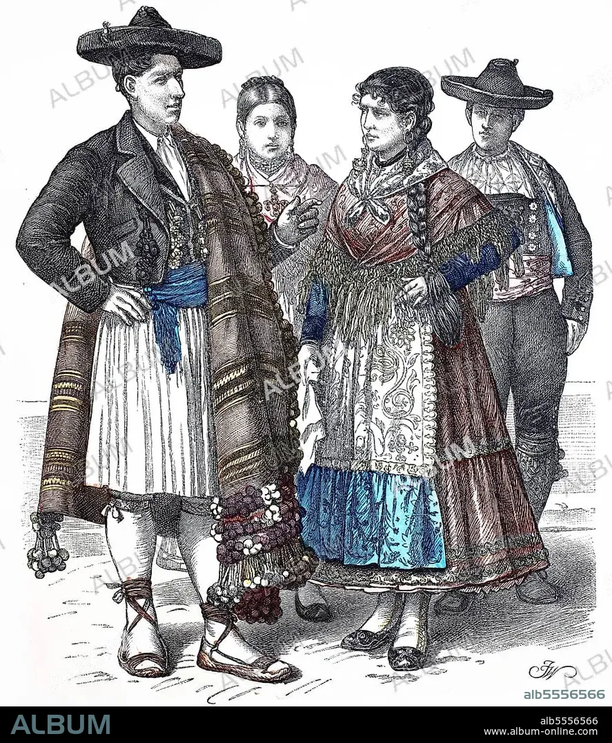 Caption: Folk traditional costume, Clothing, History of costumes, Costume from Alicante and Zamora, Spain, 1850, Historical, digitally restored reproduction of a 19th century original, Europe