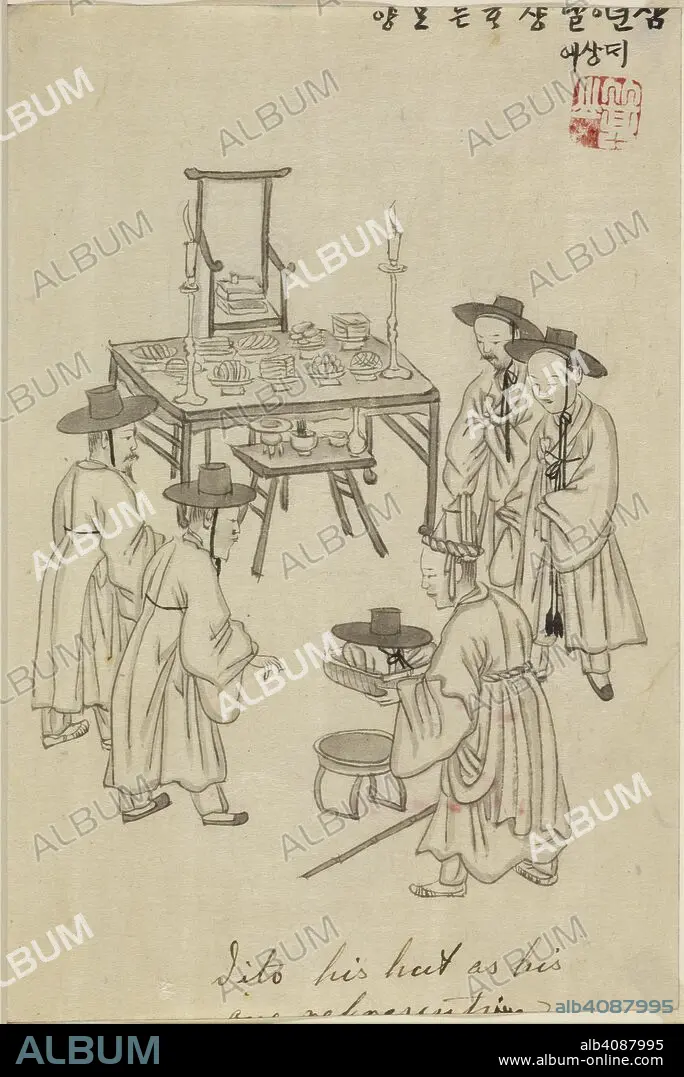 KISAN (KIM CHUN-GUN). New Year's Day offering at ancestral shrine. Kisan hwa. [Kisan paintings]. Korea, late 19th century. Album of 100 genre paintings with captions by Kisan [Kim Chun-gun, fl. 1880-1890] . Source: Or.14344, f.35. Language: Korean.