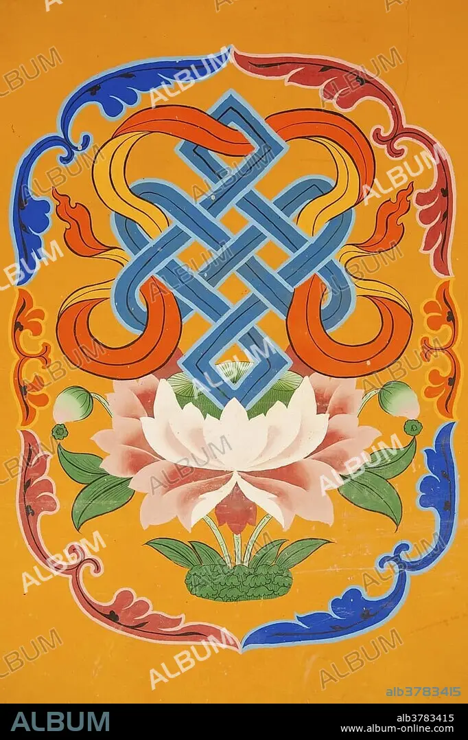Caption: Tibetan Buddhism, mural painting, emblem, endless knot above a lotus blossom, Jokhang Temple, Lhasa, Ue-Tsang, Central Tibet, Tibet Autonomous Region, Himalaya Range, People's Republic of China, Asia