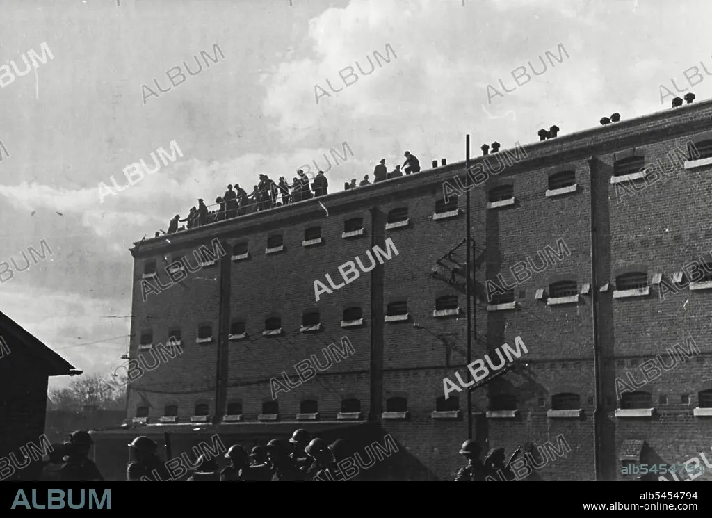 Caption: Wiggins Staff -- Prisoners on roof of Glasshouse. Tin hated soldiers stand guard in foreground. One hundred and fifty servicemen detained in the famous Aldershot Detention Barracks known as the "Glasshouse" rioted and completely wrecked their barracks over the weekend. February 24, 1946.