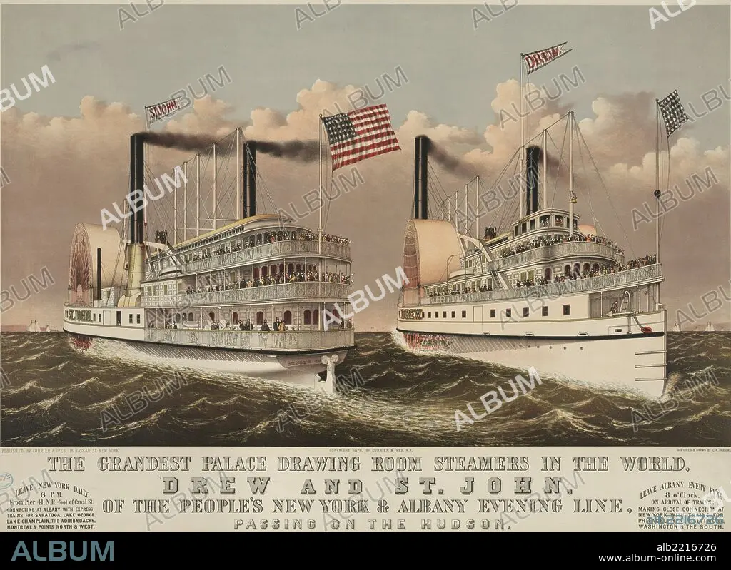 Caption: Grandest palace drawing room steamers in the world, Drew and St. John: of the people's New York & Albany evening line, passing on the Hudson
