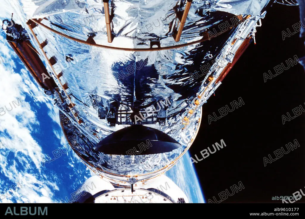 Caption: The Hubble Space Telescope orbiting the Earth, c1990s. Launched in 1990, the Hubble Space Telescope (HST) was designed to see seven times further into space than had been possible before, without the distortion caused by the Earth's atmosphere. Problems with its giant mirror meant that it did not initially work as well as expected. Corrective optics were installed in 1993, greatly improving the telescope's performance, enabling it to view the Universe in unprecedented detail. Credit ARPL/NASA.