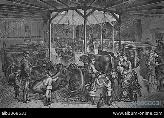 Central hall of Wille'schen Milchkuranstalt, a milk-drinking spa resort, in Dresden, Saxony, Germany, historical engraving, 1883, Europe.