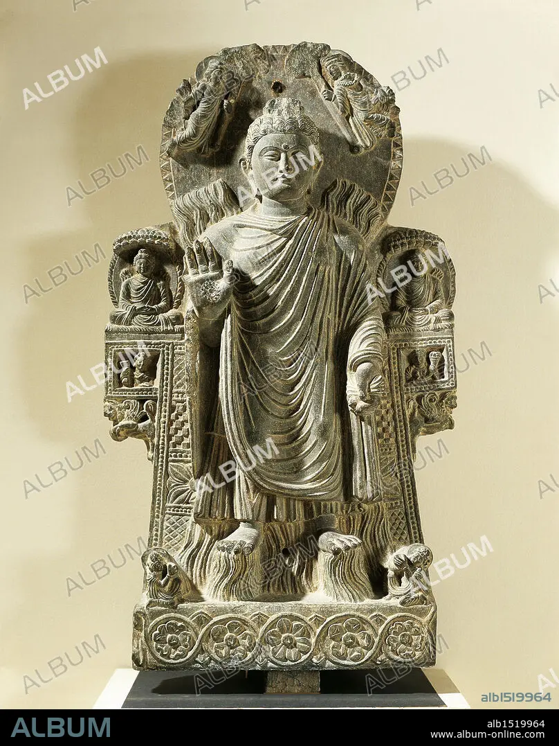 Caption: Afghanistan, Paitava, Relief depicting Buddha known as the Buddha of the Great Miracle, Schist 3rd-4th century A.D., France, Paris, Musee National des Arts Asiatiques Guimet (oriental art Museum), Afghan art