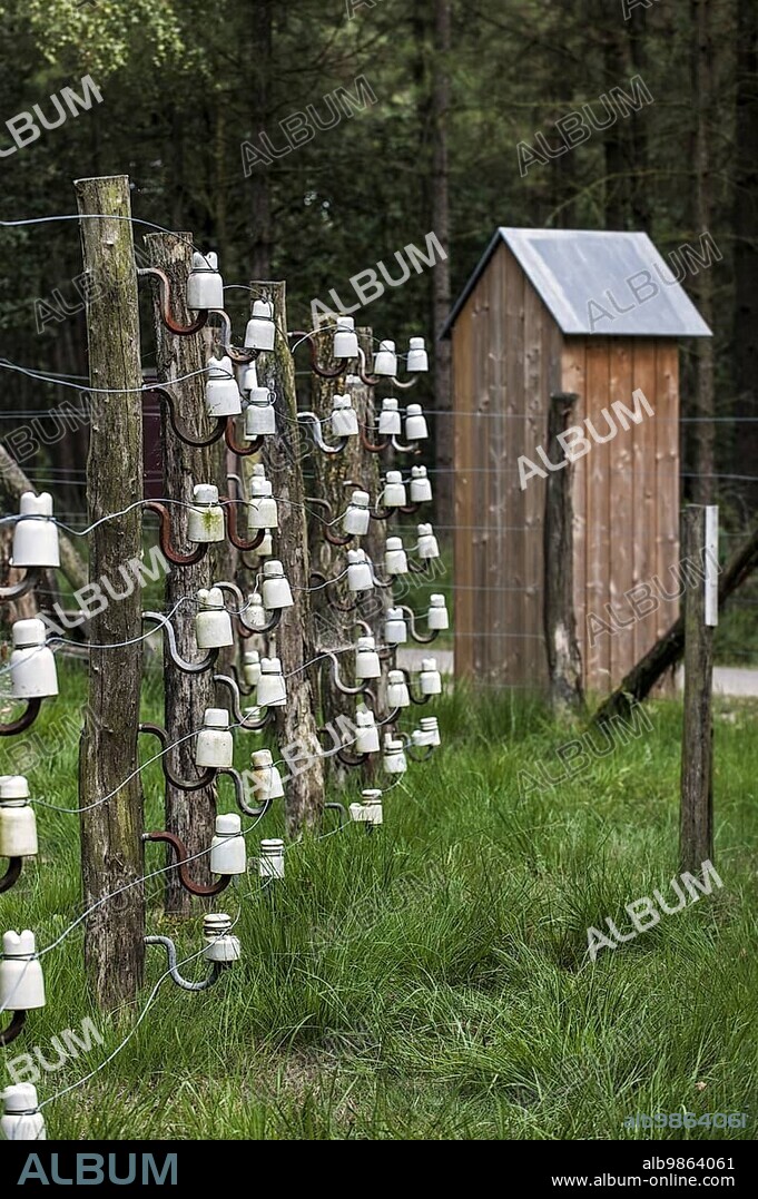 Sentry box and Wire of Death, Dodendraad, lethal electric fence created by the German military to control the Dutch-Belgian frontier during the First World War at Reusel, the Netherlands