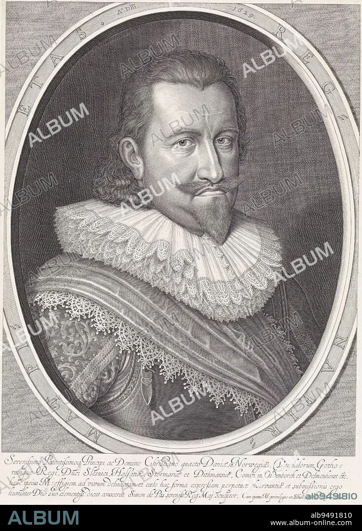 Caption: Portrait of Christian IV, King of Denmark and Norway, Simon van de Passe, 1629, Portrait of Christian IV, King of Denmark and Norway. In the border inscription of the frame his motto in Latin. In the margin a four-line caption with the name and function of the person portrayed in Latin., print maker: Simon van de Passe, (mentioned on object), Simon van de Passe, (mentioned on object), unknown, (mentioned on object), Copenhagen (city), 1629, paper, engraving, h 411 mm × w 292 mm
