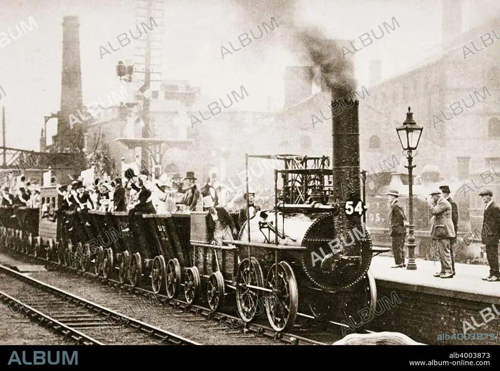 Caption: Train Number One, July 1925. A re-enactment of the first train journey, made by George Stephenson's 'Locomotion no 1' on the Stockton and Darlington Railway in 1825.