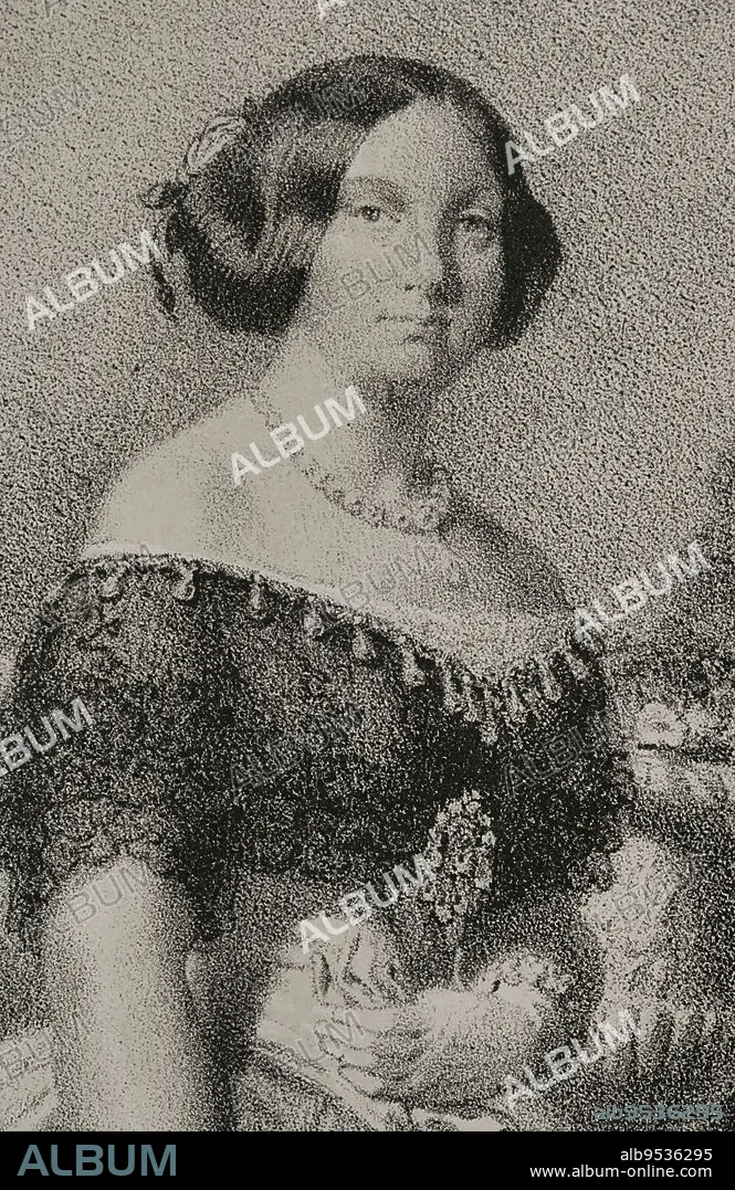 Caption: Isabella II of Spain (1830-1904). Queen of Spain from 1833 o 1868. Portrait. Drawing by J. Vallejo. Lithography by J. Donón. Detail. "Reyes Contemporáneos". Volume I. Published in Madrid, 1855.
