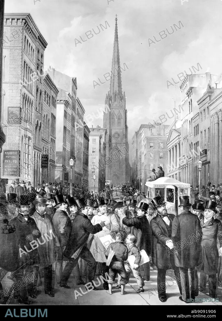 Caption: Panic of 1857 Wall Street, half past 2 o'clock, October , 13, 1857.. Painting by James H. Cafferty, N.A. and Charles G. Rosenberg.