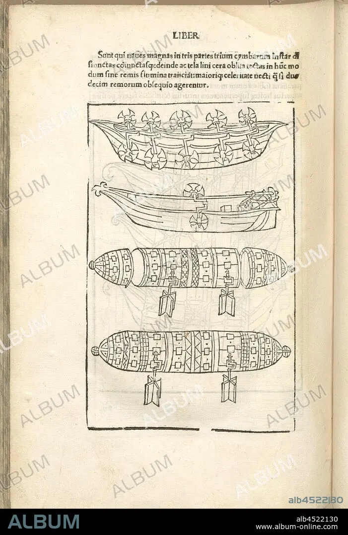Caption: Ships with wheel drive, Medieval Warfare, Military Equipment, Canoes, Ships and Floats with Wheel Drive Bridges, Crossing Water, Woodcut, p. 418, (Liber undecimus), 1483, Roberto Valturio: [De re militari]. Verona: [Boninus de Boninis], [1483]