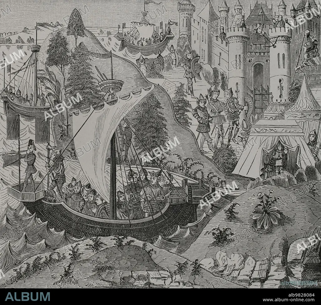 Caption: Richard I (1157-1199). King of England. After conquering the castle of Châlus-Chabrol in the Limousin region of France, on 25 March 1199 he was hit by an arrow that wounded him in the left shoulder while he was checking the perimeter of the castle without wearing chain mail. He died of his wound on 6 April. Châlus is depicted in the centre of the Limousin plateau; the artist took the liberty of including a seaport there. Engraving from "Chroniques de Normandie", 14th century. "Vie Militaire et Religieuse au Moyen Age et à l'Epoque de la Renaissance". Paris, 1877.