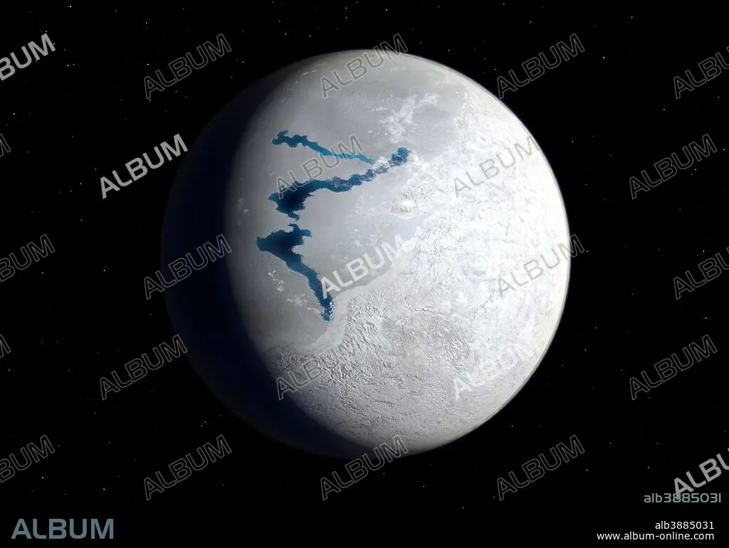 This is how the Earth may have appeared about 650 million years ago during a period when snow and ice may have covered most, if not all, of the Earth's surface and oceans. This image suggests the Earth's appearance during the Marinoan glaciation from 650 to 630 million years ago. The southern and eastern hemispheres are dominated by glacier-covered land masses while the opposing hemisphere is frozen ocean save for a few areas of exposed liquid water, AKA refugia for the Earth's surviving soft-bodied multicellular organisms.. . In addition to the Marinoan glaciation there may have been at least two, and possibly three previous Proterozoic glacial periods going back to two billion years ago. The causes of these snowball periods are unknown but may have been due to massive volcanic eruptions, massive meteoritic impacts (both resulting in global sun-reflecting ash clouds), or variance's in the Earth's orbit.