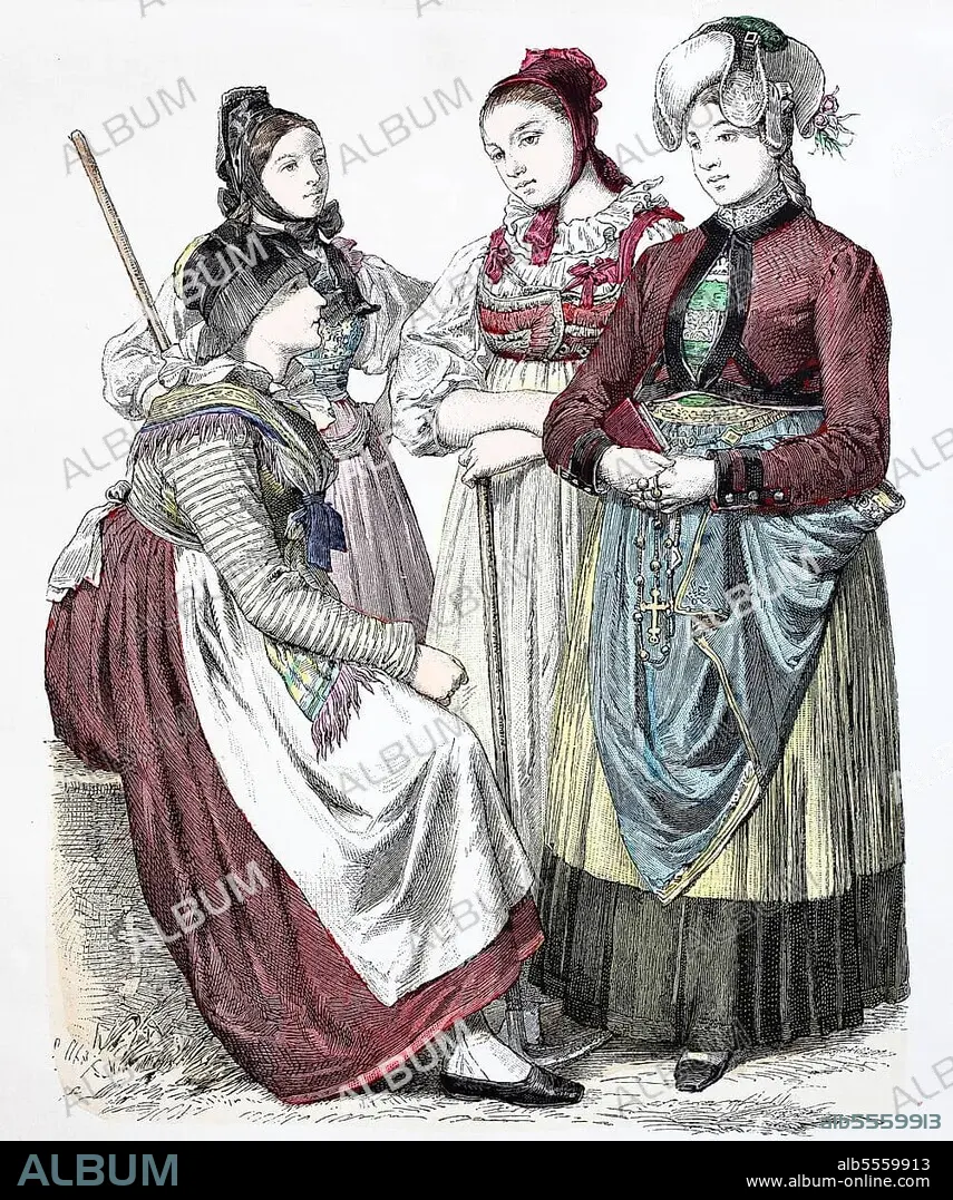 Caption: Folk traditional costume, clothing, history of costumes, woman from the Black Forest, the Schwapbachtal and from Hauenstein, Baden-Württemberg, Germany, 1885, Historical, digitally restored reproduction of a 19th century original, Europe