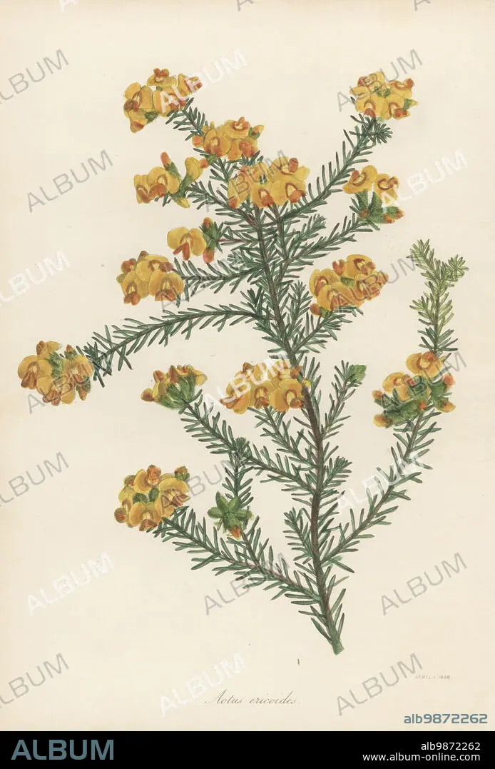 Caption: Golden aotus or golden pea, Aotus ericoides. Native to eastern Australia. Erica-like or heath-like aotus. Handcoloured lithograph from Joseph Paxtons Magazine of Botany, and Register of Flowering Plants, Volume 5, Orr and Smith, London, 1838.