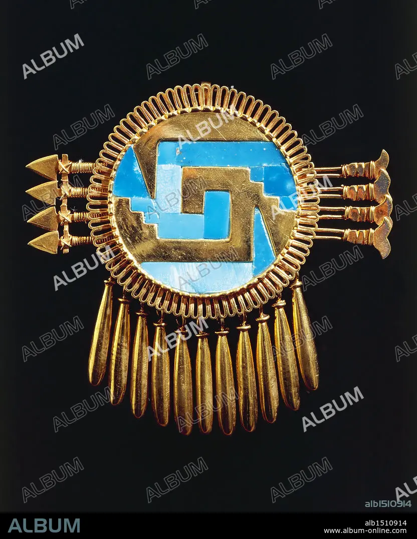 Caption: Mixtec civilization, Mexico, 7th century A.D. Goldsmith Art. Breastplate of gold and turquoise mosaic, from Yanhuitlan.
