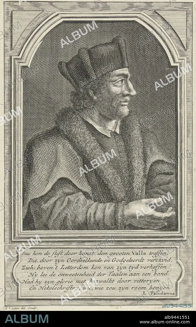 Caption: Portrait bust to the right of Lorenzo Valla, Italian humanist and philologist, with headdress and fur collar Surrounding a curved frame, below the portrait a plaque with a six-line Dutch verse, Portrait of Lorenzo Valla, print maker: Adolf van der Laan, (mentioned on object), Adolf van der Laan, (mentioned on object), Lambertus Paludanus, (mentioned on object), 1694 - 1755, paper, etching, engraving, h 167 mm × w 105 mm