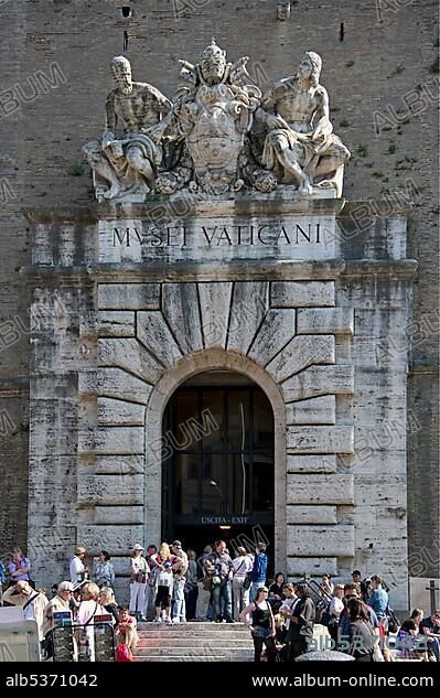 Portal to the Vatican Museums with statues of saints on the coat of arms of Pope Pius XI, Vatican Walls, Vatican City, Rome, Lazio, Italy, Europe