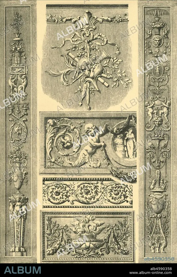 Caption: Painted plaster ornament, France, 18th century, (1898). 'Fig 1: Wood carving on a wainscot in the music room of the arsenal library at Paris, style of Louis XV [c1715-1774]. Figs 2 and 3: Carved pilaster from the wainscot of a saloon at Paris, style of Louis XVI [c1774-1792]. Fig 4: Painted frieze from the boudoir of Queen Marie Antoinette in the Castle at Fontainebleau, style of Louis XVI. Fig 5: Panel of a stucco cavetto at a ceiling of a saloon at Paris, style of Louis XVI. Fig 6. Carved wall panel above a saloon door in the Hôtel de Ville at Bordeaux, style of Louis XVI..."Zopfstyle" - this term is sometimes mistaken for Barocque, even Rococo, whilst it signifies merely the style, (certainly rather barren and stiff sometimes), which art chose under Louis XVI, in opposition as it were, to the pompous and confused style under Louis XV, by returning to the antique. Compared with the extravagances of Rococo the quiet, strict forms of the Zopfstyle produce a feeling of satisfaction in the mind of the beholder, unless, as is often the case, repose degenerates into rigidness, and strictness into barrenness'. Plate 84 from "The Historic Styles of Ornament" translated from the German of H. Dolmetsch. [B.T. Batford, London, 1898]