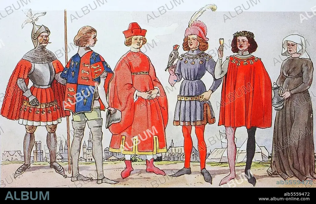 Caption: Leidung, Mode in Deutschland unter burgundischem Einfluss im 15. Jahrhundert, von links, ein Ritter in Rüstung, der Herold mit hohen Lederstiefeln, dann ein Herr im weiten Tappert, ein junger Ritter mit Falken, ein Dandy und eine Wirtin, digital restaurierte Reproduktion einer Originalvorlage aus dem 19. Jahrhundert