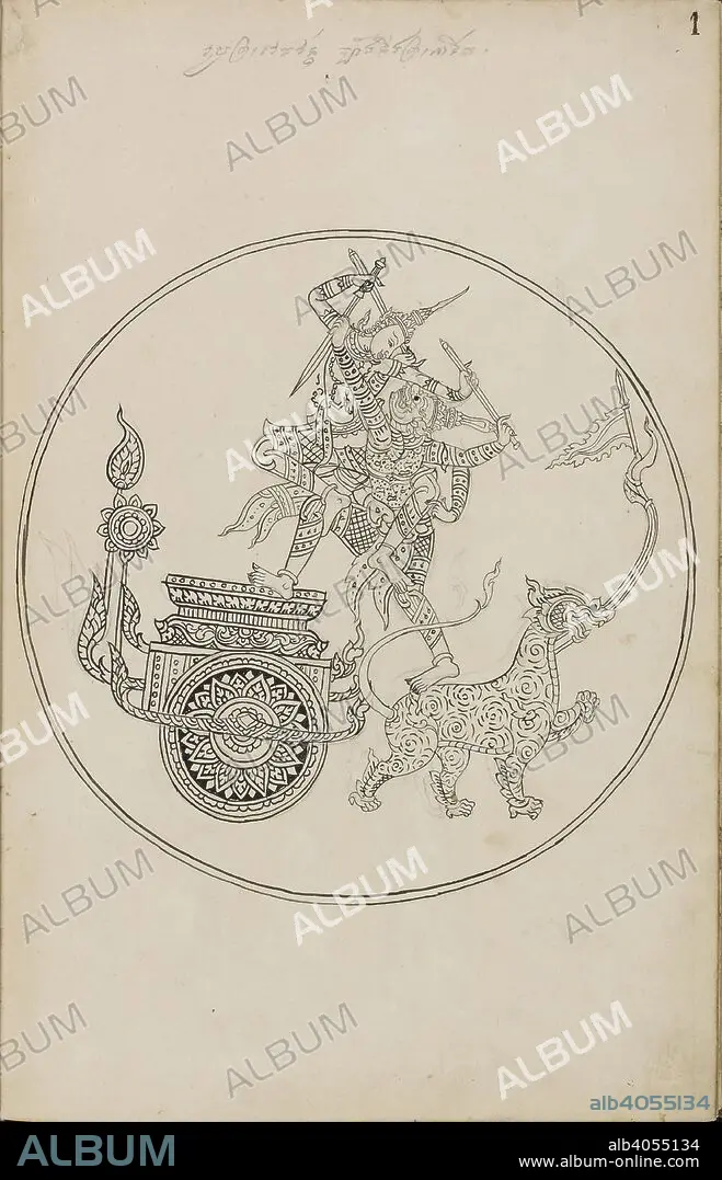Caption: Battle scene between Rama and Ravana, scene from the Ramakien (Thai version of the Ramayana) . Ramakien (Thai version of the Ramayana). 1880. Materials: European paper Dimensions: 230 mm x 355 mm Script: Khom script, a variant of Khmer script used in Thailand in pencil. Source: Or. 14859 f.1. Language: Thai.