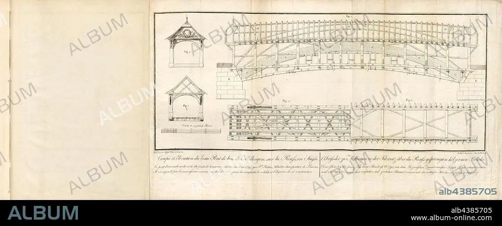 Cup and Elevation of the beautiful Mellingen Wooden Bridge, Reuss, Switzerland, Old Reuss Bridge in Mellingen, signed: Dessiné par Joseph Ritter à Lucerne; Publié à Basle par Chr. De Mechel, Fig. 3, according to p. VIII, Ritter, Joseph (dessiné); Mechel, Christian von (publié), Christian von Mechel: Plans, coupes et élévations des trois ponts de bois les plus remarquables de la Suisse, savoir: celui de Schaffhouse, sur le Rhin, celui de Wettingen sur la Limmat, et celui de Mellingen sur la Reuss; accompagnés chacun d'une description détaillée: ouvrage qui peut être considéré comme une instruction théorique et pratique pour la construction des ponts de charpente d'une longue portée. Basle (Basel): [s.n.], 1803