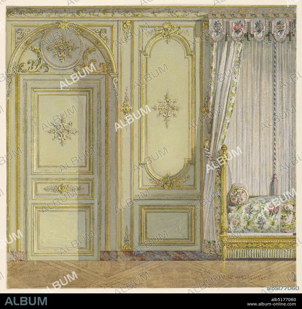 Detail, bed alcove, Palace of Fontainebleau, Frederick Marschall, Brush and watercolor, tempera, Chinese white on heavy paper, Elevation of section wall. Right, part of bed alcove; left, doorway. Marble dado, with wall surface above decorated with panels contained in narrow gold frames with central and symmetric use of rocaille motifs., USA, ca. 1885, interiors, Drawing, Drawing
