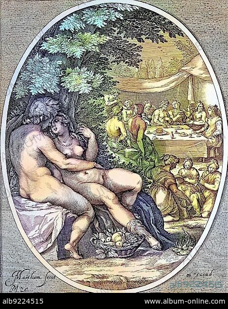 Love, Symbolic representation of sensual pleasures, a couple in an erotic situation under a tree, somewhat apart from society, Dutch copperplate engraving, J. Matham, c. 1600, digitally restored reproduction of a 19th century original, exact original date not known