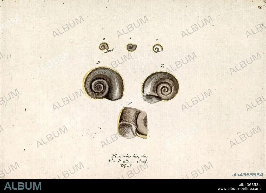 Caption: Planorbis hispidus, Print, Gyraulus albus, common name White Ramshorn, is a small species of freshwater snail, an aquatic pulmonate gastropod mollusk in the family Planorbidae, the ram's horn snails.