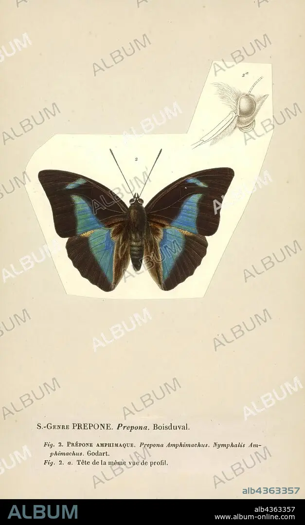 Prepona, Print, Prepona is a genus of Neotropical charaxine butterflies in the family Nymphalidae. They are strong fliers in tropical forests where they feed on fermenting fruits and animal dung. The underside of the wings is pale greyish or brownish, while the upperside is dark with distinct iridescent blue markings. A few species also have orange markings on the upperside of the wings. They are popular among butterfly collectors.