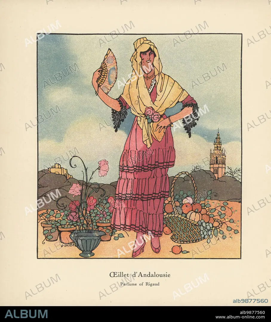Caption: Promotional art for Oeillet d'Andalousie, a discontinued Perfume of Rigaud. An Andalusian woman with fan, in shawl and ruffled skirt, stands next to a potted carnation and basket of fruit. Colour-printed illustration by Jose Gose from Andre de Fouquieres The Perfumes of Rigaud, Letters of a Parisian and and American Girl, L'art des parfums, Lettres d'un Parisien et d'une Américaine, Maison Rigaud, Parfumeur, Paris, 1915.